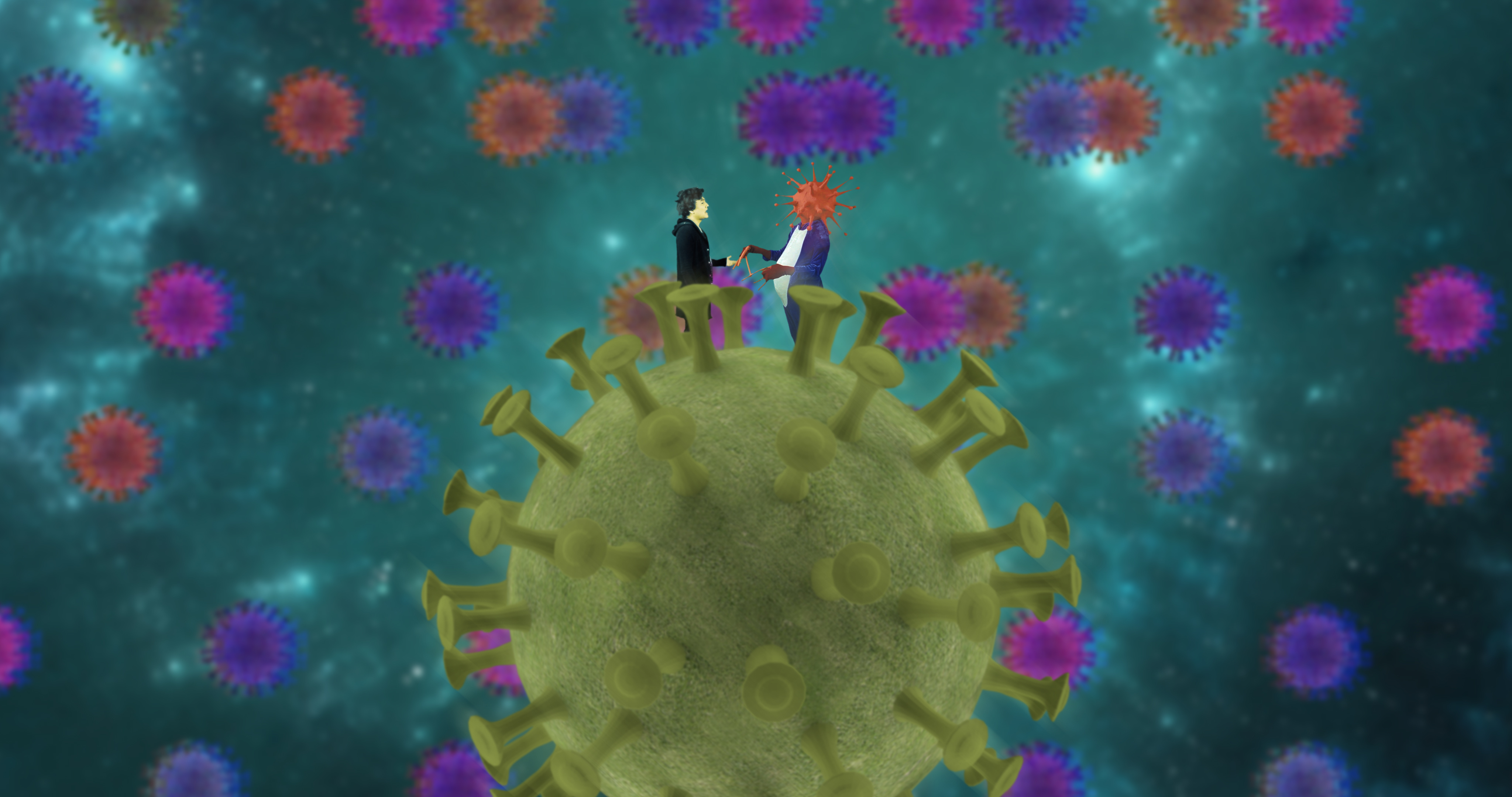 El mundo entero padece la pandemia del Coronavirus. La humanidad está en cuarentena sin poder salir de sus casas. León crea un portal para ir a un universo paralelo sin pandemia. En la mitad de su camino, entre su universo y el otro, se topa con el mismísimo Coronavirus quien le impide el paso.